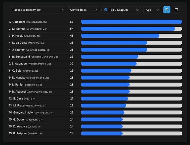 从统计数据可以看到, 本赛季欧洲七大联赛里,中卫球员向禁区传球次数榜单上塞内西仅次于巴斯托尼,排在所有同行里的第2名。