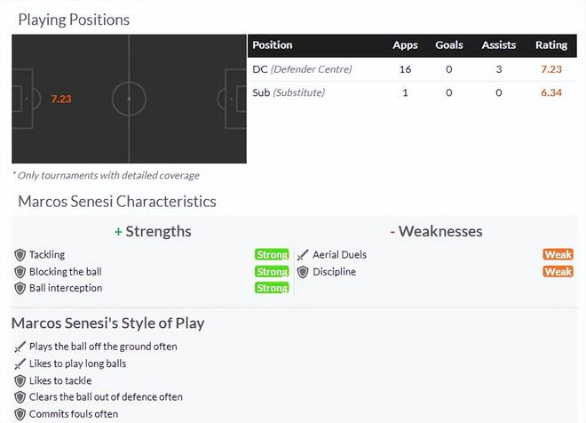 塞内西身高1米84,高球争夺在英超是不占优,不过来到西甲后应该还是够用。他擅长拦截球,对于线路的预判还是不错的。
