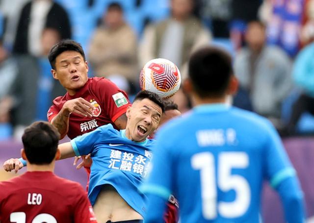 2024年10月27日,上海海港队球员李昂(左上)在比赛中和沧州雄狮队球员刘鑫瑜(右二)争顶。 当日,在2024赛季中国足球协会超级联赛第29轮比赛中,沧州雄狮队主场0比1不敌上海海港队。 新华社发(周洋摄)