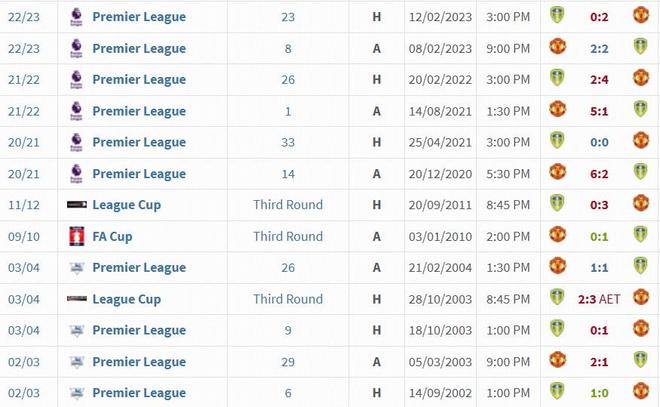 据统计,曼联近9次在联赛对阵利兹联无一败绩,取得6胜3平。上次曼联联赛不敌利兹联还要追溯至23年前:2002/03赛季英超联赛第6轮,利兹联在主场1-0小胜。